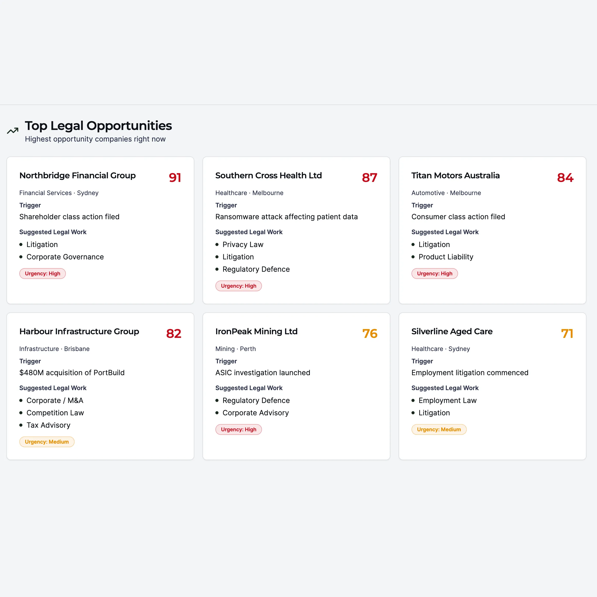 Each signal is enriched, scored, and mapped to likely practice areas, giving your firm earlier visibility into where legal work is emerging and helping teams prioritise outreach with confidence.