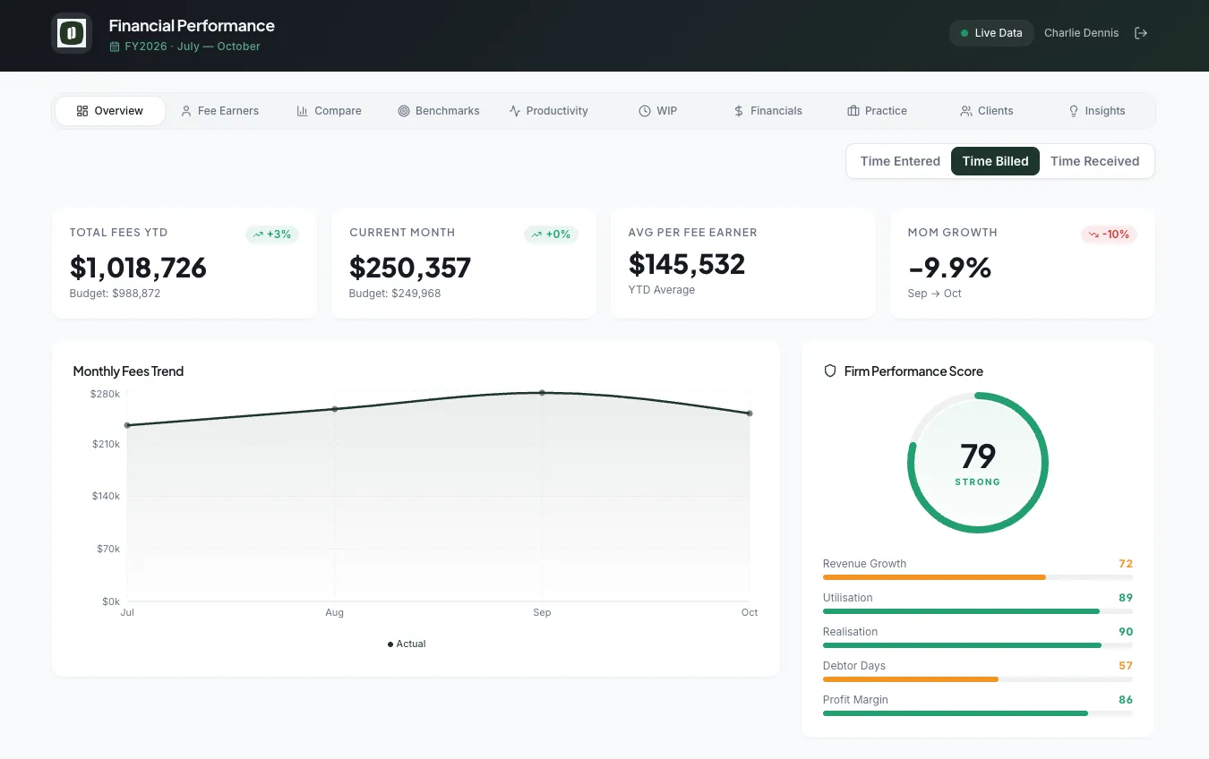 Key performance drivers such as utilisation, billing discipline, cashflow risk, matter profitability and client concentration are surfaced in one intuitive dashboard, enabling leadership teams to identify issues earlier and act with confidence.